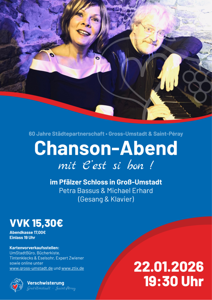 Im Jahr 2026 begeht die Stadt Groß-Umstadt ein historisches Jubiläum: Vor genau 60 Jahren wurde die Verschwisterung mit der französischen Stadt Saint-Péray besiegelt. Was 1966 als politisches Zeichen der Versöhnung begann, hat sich zu einer der lebendigsten Städtepartnerschaften der Region entwickelt. Unter dem neuen Jubiläumslogo, das Herz und Rebe vereint, steht das kommende Jahr ganz im Zeichen der deutsch-französischen Freundschaft.